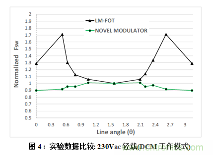 具體地講,圖3所示是開關頻率在寬輸入電壓(230Vac-左和115Vac-右)範圍和所有負載條件中(CCM-左, DCM - 右)保持恒定。與標準LM-FOT方法相比,本文提出的創新調製器的性能大幅改進,特別是在高壓線DCM運行模式更為明顯,如圖4所示。