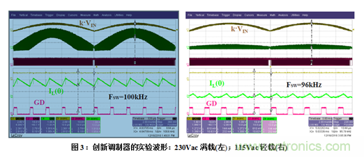 圖3和4分別是實驗波形和內置[2]的LM-FOT調製器的400W PFC [8]與這款創新的調製器的性能比較。