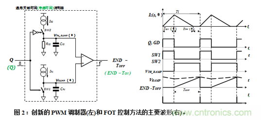 本文介紹一種創新的自適應穩壓器(AC/DC或DC/DC)脈寬調製器(PWM),基於“固定關斷時間(FOT)”或“恒定導通時間(COT)”控製方法,可以在全工況下(例如,滿負載CCM或中低負載DCM模式,寬輸入輸出電壓)以恒定開關頻率工作,無轉換器的寄生參數(例如,功率開關和濾波電感器的電阻)的負麵影響。此外,本文提出的調製器電路與轉換器拓撲無關(升壓、降壓、反激式等),隻與功率開關管柵極驅動邏輯信號(GD)有關,節省芯片引腳數量,且/或降低設計複雜程度。