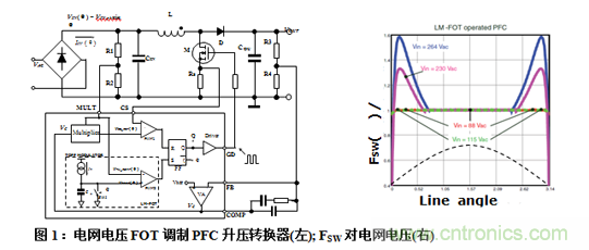例如,用FOT方法控製CCM PFC前級升壓穩壓器,導致開關頻率隨電網電壓和負載條件而發生明顯變化[1]。按照實時電網電壓調製關斷時間,可以降低開關頻率(TOFFKt Vin, pksinθ), 如圖1所示,隻要升壓級是CCM模式,最終開關頻率是恒定的[2],如圖1右圖所示。