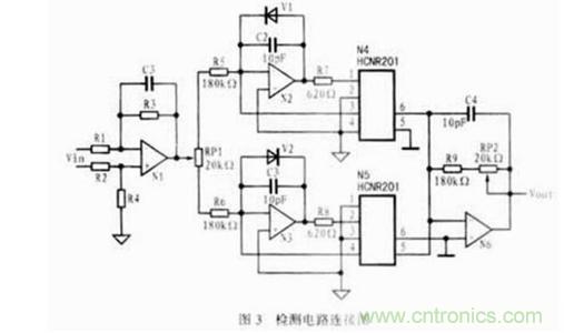 在實際檢測電路的某一采集信道中,如需對一組差動輸入信號進行檢測,可將電路接成如圖3所示的連接方式。圖中,通過放大器N1可將輸入的差動信號變為單邊信號後輸出。由於二極管V1和V2的作用,當輸入信號為正時,V2導通,V1截止,放大器N2呈開環狀態,光耦N5工作,N4關斷;而當輸入信號為負時,則正好相反。當HCNR201的第3、4端的光敏二極管受光後,其輸出信號將反饋到放大器的輸入端,以提高光耦的線性並減少溫漂。第5、6端輸出的信號經運放放大後輸出。電位器RP1的作用是調節運放輸入偏置電流的大小。電容C2、C3為(wei)反(fan)饋(kui)電(dian)容(rong),可(ke)用(yong)於(yu)提(ti)高(gao)電(dian)路(lu)的(de)穩(wen)定(ding)性(xing),消(xiao)除(chu)自(zi)激(ji)振(zhen)蕩(dang),濾(lv)除(chu)電(dian)路(lu)中(zhong)的(de)毛(mao)刺(ci)信(xin)號(hao),降(jiang)低(di)電(dian)路(lu)的(de)輸(shu)出(chu)噪(zao)聲(sheng),其(qi)容(rong)值(zhi)可(ke)根(gen)據(ju)電(dian)路(lu)的(de)頻(pin)率(lv)特(te)性(xing)來(lai)選(xuan)取(qu)。放(fang)大(da)器(qi)N6的作用是把光耦輸出的電流信號轉變為電壓信號以供後級電路使用,並增強負載驅動能力,降低輸出阻抗。調整電阻RP2的值可以調整信道的增益。