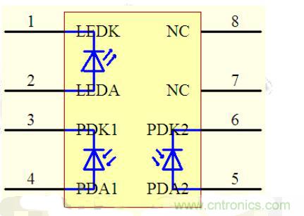 HCNR200/201包括一隻高性能的發光二極管(圖中的LED),兩隻極其相似的光電二極管(圖中的PD1和PD2)。當LED中流過電流If時。其發出的光會在PD1和PD2中感應出正比於LED發光強度的光電流Ipd1和Ipd2。由於PD1和PD2的特性非常相似,再加上安裝位置的精確性以及元件先進的封轉設計保證了該元件的高線性度和增益的穩定性。