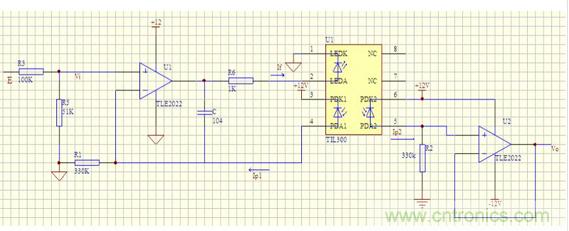 由於按照線性光耦的技術說明,發射端和兩個接受端都使用時能在一定範圍因此,本電路將線性光耦的D0,D1,D2端都配置了相關電路。