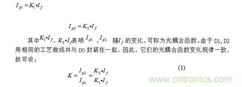 電容C防止電路產生震蕩。TIL300內部DO是發光二極管,其工作電流電If可選為10mA。D1,D2為光敏二極管,他們受DO的激發分別產生電流IP1和Ip2,其大小與If有關: