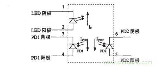 線xian性xing光guang耦ou的de隔ge離li原yuan理li與yu普pu通tong光guang耦ou沒mei有you差cha別bie,隻zhi是shi將jiang普pu通tong光guang耦ou的de單dan發fa單dan收shou模mo式shi稍shao加jia改gai變bian,增zeng加jia一yi個ge用yong於yu反fan饋kui的de光guang接jie受shou電dian路lu用yong於yu反fan饋kui。這zhe樣yang,雖sui然ran兩liang個ge光guang接jie受shou電dian路lu都dou是shi非fei線xian性xing的de,但dan兩liang個ge光guang接jie受shou電dian路lu的de非fei線xian性xing特te性xing都dou是shi一yi樣yang的de。這zhe樣yang,就jiu可ke以yi通tong過guo反fan饋kui通tong路lu的de非fei線xian性xing來lai抵di消xiao直zhi通tong通tong路lu的de非fei線xian性xing,從cong而er達da到dao實shi現xian線xian性xing隔ge離li的de目mu的de。