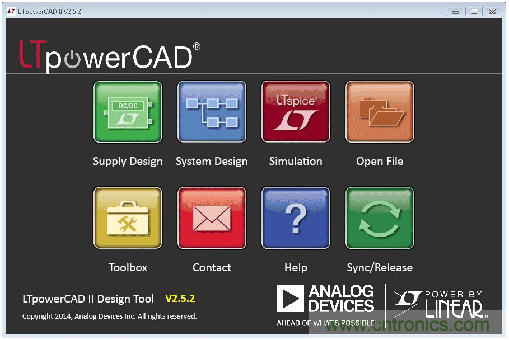 LTpowerCAD可用來為各個電壓軌提供電源解決方案。它還提供一係列參考設計,以讓設計人員快速入門。LTpowerCAD可以從ADI公司網站免費下載。