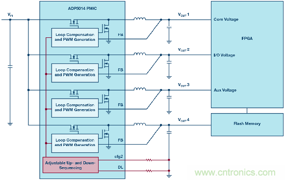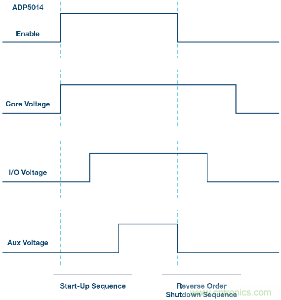 圖2. ADP5014 PMIC集成了對靈活控製上電/關斷時序的支持。