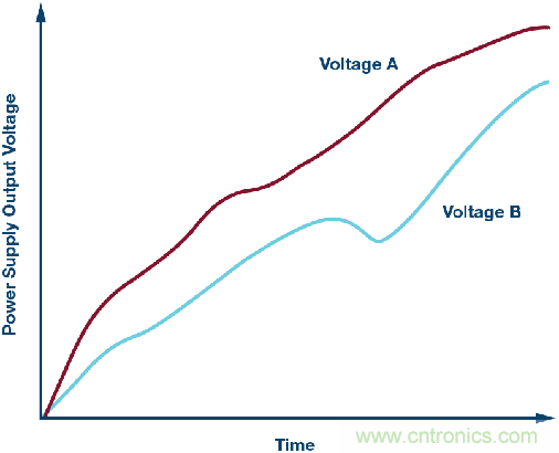 除了電壓時序之外,啟動過程中還可能要求電壓單調上升。這意味著電壓僅線性上升,如圖4中的電壓A所示。此圖中的電壓B是(shi)電(dian)壓(ya)非(fei)單(dan)調(tiao)上(shang)升(sheng)的(de)例(li)子(zi)。在(zai)啟(qi)動(dong)過(guo)程(cheng)中(zhong),當(dang)電(dian)壓(ya)上(shang)升(sheng)到(dao)一(yi)定(ding)電(dian)平(ping)時(shi)負(fu)載(zai)開(kai)始(shi)拉(la)大(da)電(dian)流(liu),就(jiu)會(hui)發(fa)生(sheng)這(zhe)種(zhong)情(qing)況(kuang)。防(fang)止(zhi)這(zhe)種(zhong)情(qing)況(kuang)的(de)一(yi)種(zhong)辦(ban)法(fa)是(shi)延(yan)長(chang)電(dian)源(yuan)的(de)軟(ruan)啟(qi)動(dong)時(shi)間(jian),並(bing)選(xuan)擇(ze)能(neng)夠(gou)快(kuai)速(su)提(ti)供(gong)大(da)量(liang)電(dian)流(liu)的(de)電(dian)源(yuan)轉(zhuan)換(huan)器(qi)。