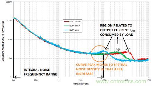 但是,如何表示LDO輸出的噪聲有多大呢?可用如上文所示的積分噪聲頻率範圍表示。這個範圍通常是10赫茲至100千赫。
