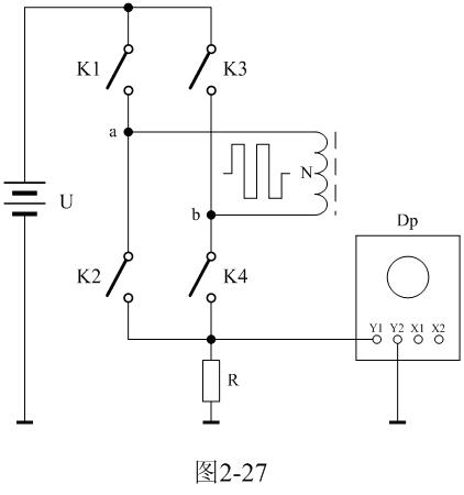 圖2-27中,U是電源電壓,N為變壓器初級線圈,控製開關K1、K2、K3、K4組成橋式開關控製電路,K1和K4為一組,K2和K3為一組,兩組開關輪流接通與斷開,把電源電壓正反向加於變壓器初級線圈兩端;R為取樣電阻,通過測量R兩端的電壓,就可以知道流過變壓器初級線圈的電流;取樣電壓被送到示波器Dp進行顯示。