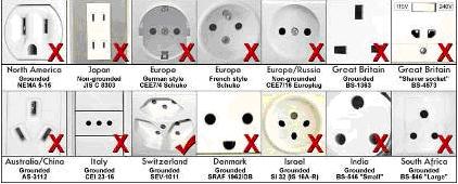 這些插頭/座大多彼此互不兼容,如果再把同一類型中耐壓、功率的差別計入在內,種類就更多了。這種情況顯然造成:即使電器設備供電電壓相同,也無法在不同地區使用。國際電工委員會(IEC)曾經在1986年和1992年頒布了電源插頭/座的國際標準:針對250V電壓等級的IEC60906-1和針對125V電壓等級的IEC60906-2。其3芯插頭外觀(圖2.1)類似於表2.1中的J型,由於與全球範圍內大多數插頭/座不兼容(圖2.2),推行受到很大阻力。