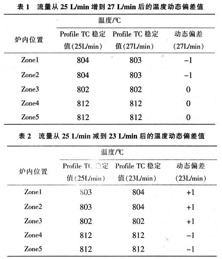 (4)手動調節大N2流量,從25L/min,減少到23L/min,記錄流量調節前後穩定溫度值和流量變化導致的溫度動態偏差值,見表2,表中Zone1為爐尾,Zone2是爐中尾,Zone3為爐中,Zone4是爐中口,Zone5為爐口。