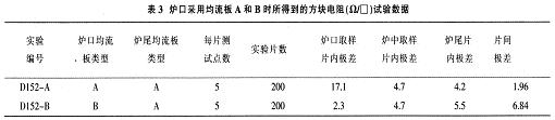 通過表5分(fen)析(xi)爐(lu)口(kou)片(pian)內(nei)極(ji)差(cha)大(da)的(de)具(ju)體(ti)原(yuan)因(yin),得(de)到(dao)極(ji)差(cha)大(da)主(zhu)要(yao)是(shi)由(you)矽(gui)片(pian)下(xia)半(ban)部(bu)分(fen)方(fang)塊(kuai)電(dian)阻(zu)大(da)造(zao)成(cheng)的(de),而(er)這(zhe)下(xia)半(ban)部(bu)分(fen)又(you)與(yu)排(pai)氣(qi)口(kou)最(zui)近(jin),故(gu)采(cai)取(qu)調(tiao)小(xiao)排(pai)氣(qi)閥(fa)開(kai)度(du),增(zeng)加(jia)爐(lu)內(nei)壓(ya)強(qiang),間(jian)接(jie)地(di)增(zeng)加(jia)工(gong)藝(yi)氣(qi)體(ti)反(fan)應(ying)時(shi)間(jian),從(cong)而(er)改(gai)善(shan)爐(lu)口(kou)片(pian)內(nei)均(jun)勻(yun)性(xing)和(he)片(pian)間(jian)均(jun)勻(yun)性(xing)。對(dui)於(yu)穩(wen)定(ding)生(sheng)產(chan)而(er)言(yan),爐(lu)內(nei)壓(ya)強(qiang)的(de)最(zui)佳(jia)值(zhi)是(shi)在(zai)一(yi)定(ding)範(fan)圍(wei)內(nei)的(de),這(zhe)就(jiu)要(yao)求(qiu)工(gong)藝(yi)反(fan)應(ying)氣(qi)體(ti)流(liu)量(liang)與(yu)廢(fei)氣(qi)排(pai)放(fang)量(liang)需(xu)保(bao)持(chi)一(yi)個(ge)整(zheng)體(ti)平(ping)衡(heng)。