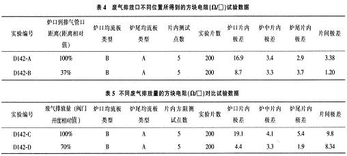 從表4可看出,廢氣排放口離恒溫區越遠,即離爐口越近,爐口的方阻片內/片間均勻性改善越好,但廢氣排放的同時也有大量熱能的排放,在排放口區域聚集的熱能較多,因考慮到爐門的低溫(一般為小於200℃)要求,在一定程度上又限製了排放口到爐門的距離不能太近。所以,生產中廢氣排放口的較佳位置是在一個兩向平衡距離範圍內。