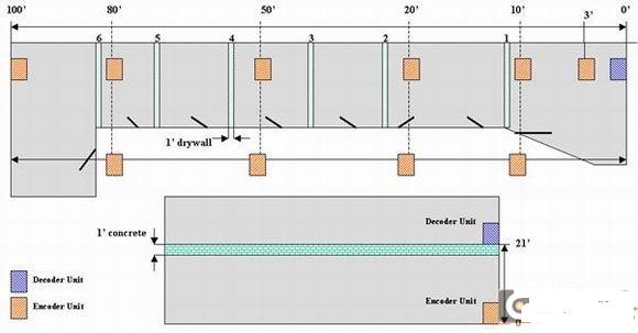 相對於可視距離的無線通信的應用,802.11n可實現更遠距離的(非可視距離)的多媒體通信,比如在家裏的不同房間之間的音視頻通過無線播放。我們用標準的802.11的產品用來測試,證明魯棒性很好,可以穿越牆壁和混凝土樓板,圖-1是測試環境圖示,用SONY的PS3遊戲機作為高清的視頻源,源和顯示設備之間距離100英尺並穿越6麵牆,視頻的內容包括遊戲和電影視頻。表5是測試結果,一組是編碼端和解碼端都是2x3MIMO(2個發送天線和3個接收天線)的無線設備,另一組采用編碼端2x3MIMO,接收端2x2MIMO的無線設備。WW602編碼用20Mbps碼流的圖像質量可超越高清電纜傳輸的6-15Mbps的圖像質量。