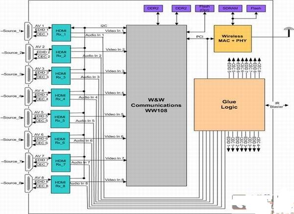 圖-2展示了基於WW602的單碼流無線HDMI方案的框圖。圖-3展示了基於WW108的多碼流無線媒體集線器方案的框圖.在這些方案中,隻有視頻經過壓縮和解壓,而音頻和控製信號,如HDMICEC和EDID,都是通過無線信道直傳的。