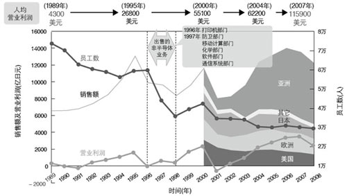 在這一巨大的轉變過程中,TI公司的營收也發生著變化。雖然1995年後營收出現縮減,但隨著DSP/模擬業務規模的不斷擴大,到2006~2007年,公司的營收便超過了變革以前的水平。尤其值得特別一提的是,公司員逐年減少,員工人均營業利潤的增長卻異常迅速,從1989年的人均4300美元、1995年的2。68萬美元,增長到了2007年的11。59萬美元,在l8年間增長了27倍,1995年~2007年的12年間也增長了4倍多。而且,公司在半導體業的排名也從1995年的第7位提升到了近年很穩定的3~4位。