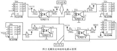 zaichangxianchuanshuzhong,zhengshiyinweidixiandejiaoliuzukangtexing,shidedixianchengledianluzhongshishishangdezuidazaoshengyuan。dixianzaochengganraodezhuyaoyuanyinshidixiancunzaizukang,dangdianliuliuguodixianshi,huizaidixianshangchanshengdianya,zhejiushidixianzaosheng。zaizhegedianyadequdongxia,huichanshengdixianhuanludianliu,xingchengdihuanluganrao。nanyufasonghejieshoushebeigongyongyiduandixian,huixingchenggonggongzukangouhe。caiyongguangdiangeliqiTLP521-4對發送和接收設備進行電氣隔離,對於減小交流阻抗的作用十分明顯,進而增大傳輸電流,有效地抑製地線噪聲;同時由於74LS244N的應用。總線驅動能力得到保障。圖2為光耦發送和接收電路示意圖。圖2中,上半部兩光耦自左向右傳輸信號,下半部兩光耦自右向左傳輸信號,左端74LS244N通過靜態存儲器IDT7132與處理器進行數據交換,右端通過8255與處理器進行數據交換。