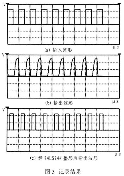 調試中,輸入周期為100μs,占空比為1/2的+5V方波,對一路光耦的輸入端波形和經過20m長線後接收光耦的輸出端波形以及經過74LS244整形後的波形進行記錄。記錄結果如圖3所示。