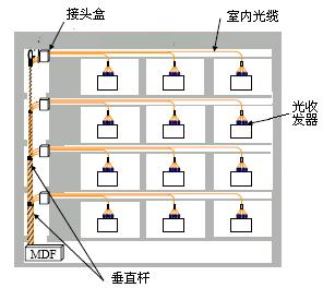 總配線架(MDF)安裝在大樓內的公共地區,光纜通過垂直的杆狀物通向各樓層,再通過水平方向上的管道進入房間。