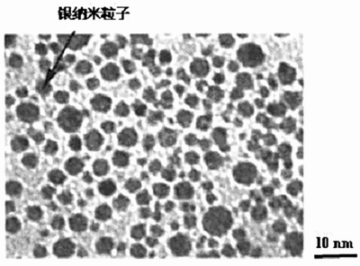 由於納米粒子表麵呈活性,為防止其自身凝聚必須要做表麵控製。我們所用的納米粒子是平均直徑為10nm左右的銀納米粒子,其表麵用有機物保護層進行了塗覆。圖3為有機物—銀複合納米粒子的掃描電鏡圖像,圖4為其結構模式圖。