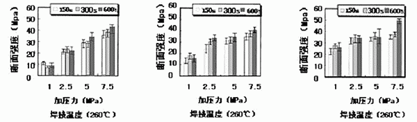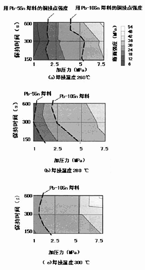 圖9顯示了焊接溫度、焊接時間、加jia壓ya等deng焊han接jie參can數shu對dui銀yin納na米mi粒li子zi銅tong觸chu點dian斷duan麵mian強qiang度du的de影ying響xiang。從cong圖tu可ke得de,焊han接jie溫wen度du和he加jia壓ya是shi影ying響xiang斷duan麵mian強qiang度du的de關guan鍵jian參can數shu。在zai焊han接jie溫wen度du方fang麵mian,強qiang度du隨sui著zhe加jia壓ya增zeng大da而er上shang升sheng,但dan在zai焊han接jie溫wen度du高gao的de情qing況kuang下xia,加jia壓ya的de影ying響xiang會hui變bian小xiao。另ling外wai就jiu焊han接jie溫wen度du而er言yan,加jia壓ya低di的de情qing況kuang下xia,焊han接jie溫wen度du對dui強qiang度du影ying響xiang大da,而er加jia壓ya增zeng高gao時shi則ze焊han接jie溫wen度du的de影ying響xiang變bian小xiao。所suo以yi,在zai260℃左右的溫度下加大壓力,而盡可能在低加壓場合提高連接溫度,這樣做才最有效。