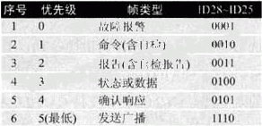 本(ben)協(xie)議(yi)采(cai)用(yong)幀(zhen)優(you)先(xian)原(yuan)則(ze)分(fen)配(pei)標(biao)識(shi)符(fu),每(mei)一(yi)幀(zhen)標(biao)識(shi)符(fu)中(zhong)的(de)高(gao)四(si)位(wei)表(biao)示(shi)幀(zhen)類(lei)型(xing),不(bu)同(tong)幀(zhen)類(lei)型(xing)有(you)不(bu)同(tong)的(de)優(you)先(xian)權(quan),優(you)先(xian)權(quan)決(jue)定(ding)了(le)各(ge)種(zhong)信(xin)息(xi)幀(zhen)在(zai)同(tong)等(deng)情(qing)況(kuang)下(xia)的(de)發(fa)送(song)順(shun)序(xu),協(xie)議(yi)中(zhong)的(de)29位標識符的分配如下: