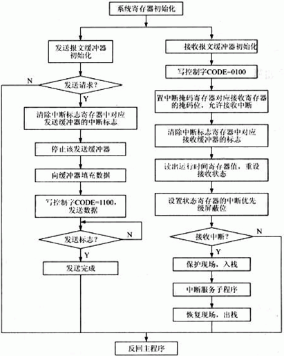 gekongzhiqiyinganguidinggeshihezhouqifasongshujudaozongxianshang,tongshiyeyaojieshouqitakongzhiqidexinxi。zongxianshangdeqitakongzhiqizegenjuxuyaogequsuoxudebaowen。duiyujieshoushuju,benxitongcaiyongzhongduanfangshishixian。yidanzhongduanfasheng,jijiangjieshoudeshujuzidongzhuangzaidaoxiangyingdebaowenjicunqizhong,cishihaikecaiyongpingbilvbofangshi,liyongpingbilvbojicunqiduijieshoubaowendebiaoshifuheyuxianzaijieshouhuanchongqichushihuashishedingdebiaoshifujinxingyouxuanzedizhuweibijiao,zhiyoubiaoshifupipeidebaowencainengjinrujieshouhuanchongqi,naxiebufuheyaoqiudebaowenzejiangbeipingbiyujieshouhuanchongqizhiwai,congerjianqingCPU處(chu)理(li)報(bao)文(wen)的(de)負(fu)擔(dan)。此(ci)外(wai),不(bu)同(tong)數(shu)據(ju)應(ying)放(fang)入(ru)不(bu)同(tong)的(de)報(bao)文(wen)寄(ji)存(cun)器(qi)中(zhong),因(yin)此(ci)在(zai)接(jie)收(shou)中(zhong)斷(duan)服(fu)務(wu)程(cheng)序(xu)中(zhong),就(jiu)可(ke)以(yi)容(rong)易(yi)地(di)判(pan)斷(duan)出(chu)中(zhong)斷(duan)是(shi)由(you)哪(na)個(ge)接(jie)收(shou)報(bao)文(wen)引(yin)起(qi)的(de),其(qi)程(cheng)序(xu)流(liu)程(cheng)圖(tu)如(ru)圖(tu)3所示。