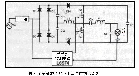 L6574芯片是意法半導體公司的高性能鎮流器驅動器,被設計為離線式600V雙極-互補金屬氧化半導體,是電子節能燈鎮流器半橋型轉換器。為了更好地調光,除了加入PFC電路之外,還加入了L6574芯片的采樣及控製電路,圖2為L6574芯片的應用調光控製示意圖。