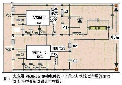 圖4為應用VK06TL驅動電路的一個熒光燈慎流器專用的驅動器,即半橋變換器設計方案圖。