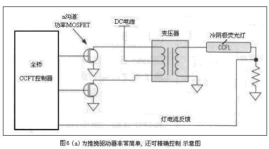 之所以考慮推挽驅動器,因它有很多好處。這種架構隻用到n溝道MOSFET(見圖6(a)所示),這有利於降低成本和增加逆變器效率。它很容易適應較高的逆變器直流電源電壓。采用更高的逆變器直流電源電壓時,隻需選擇具有合適的漏-源擊穿電壓的MOSFET即可。不管逆變器的直流電源電壓如何,都可采用同樣的CCFL控製器。但采用n溝道MOSFET的全橋和半橋架構就無法做到這一點。對於LCD電視非常理想,因為電視中的逆變器直流電源電壓通常會被穩定在±20%。