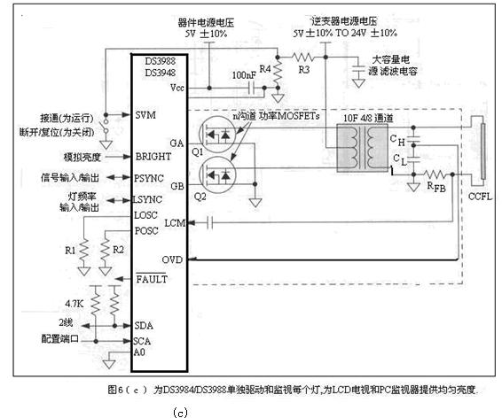 圖6(c)為用DS3984(4通道)和DS3988(8通道)CCFL控kong製zhi器qi既ji解jie決jue了le本ben文wen所suo提ti到dao的de所suo有you這zhe些xie設she計ji挑tiao戰zhan。可ke將jiang這zhe些xie器qi件jian配pei置zhi為wei每mei個ge通tong道dao驅qu動dong一yi個ge燈deng,或huo者zhe每mei通tong道dao多duo個ge燈deng,用yong戶hu可ke靈ling活huo裁cai減jian設she計ji,以yi滿man足zu自zi己ji的de性xing價jia比bi目mu標biao。多duo個geDS3984/DS3988可輕鬆級聯,以支持任意數量的燈,來為LCD電視屏提供背光照明。