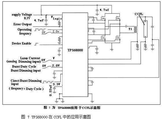 高效移相全橋CCFL控製器主要特點:輸入電壓範圍:8V至30V;集成了門驅動的全橋技術,用於4-NMOS轉換;同步恒定工作頻率;可編程相位延遲用於控製從操作的運行頻率;光—電壓穩壓以及光—電流穩流;模擬調光及脈衝調光;多控製器件下的可調節分置式脈衝調光;啟動或出錯狀態下可程序化的校正電壓時長;開燈保護和短路保護;內置高溫保護與低電壓鎖定模式;封裝模式為30引腳TSSOP封裝.。TPS68000高效移相全橋CCFL控製器單燈應用圖見圖7所示。