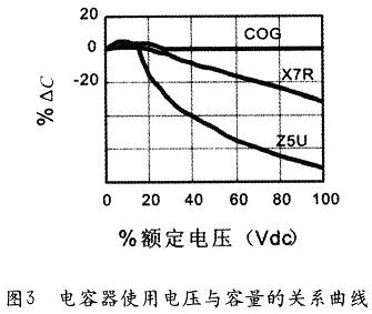 ①電容器的使用電壓對電容器的電容量有影響,穩定性低的介質,在施加額定工作電壓後容量會大幅度下降(見圖3),以至達不到使用效果,這一點在選擇電容器時必須給以充分注意(不能一味追求大容量和小體積,必須在容量和使用電壓上留有充分餘地)。