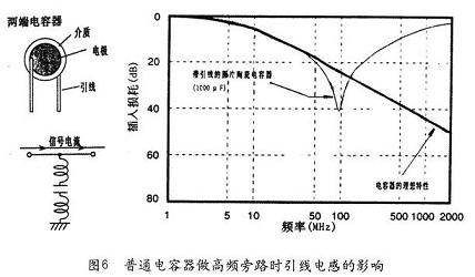 我(wo)們(men)平(ping)常(chang)使(shi)用(yong)的(de)陶(tao)瓷(ci)圓(yuan)片(pian)電(dian)容(rong)器(qi)作(zuo)為(wei)旁(pang)路(lu)電(dian)容(rong),可(ke)以(yi)將(jiang)高(gao)頻(pin)幹(gan)擾(rao)短(duan)路(lu)到(dao)地(di),達(da)到(dao)抗(kang)幹(gan)擾(rao)的(de)目(mu)的(de)。但(dan)是(shi)電(dian)容(rong)器(qi)的(de)引(yin)線(xian)電(dian)感(gan)及(ji)電(dian)容(rong)內(nei)部(bu)的(de)剩(sheng)餘(yu)電(dian)感(gan)卻(que)限(xian)製(zhi)了(le)它(ta)的(de)高(gao)頻(pin)特(te)性(xing)發(fa)揮(hui)。圖(tu)6是普通電容器做高頻旁路時的引線電感影響例。