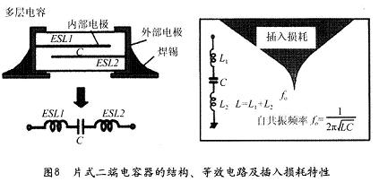 從圖6中可見,電容器的插入損耗一開始隨頻率增加而增加,直至達到自諧振頻率(等效電感與電容的串聯諧振),插入損耗也達到最大值。此後,由於等效電感的感抗增大,使插入損耗開始下降。