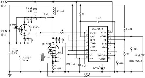 如果USB外設需要5V電源,事情就稍為有些棘手,因為USB口kou的de外wai供gong電dian壓ya可ke能neng略lve高gao於yu也ye可ke能neng略lve低di於yu這zhe一yi數shu值zhi。為wei此ci,以yi往wang常chang用yong先xian升sheng壓ya再zai降jiang壓ya或huo先xian降jiang壓ya再zai升sheng壓ya的de辦ban法fa。這zhe在zai需xu要yao多duo種zhong輸shu出chu電dian壓ya的de場chang合he,倒dao也ye不bu失shi為wei一yi條tiao可ke行xing途tu徑jing;但若僅需單一的5V輸出,此類電路結構便難免“疊床架屋”之嫌。或許正是這一緣故,上述之SEPIC盡管電路複雜,成本也高,但因其能集升壓、降壓功能於一身,所以近來已呈應用漸廣之勢。