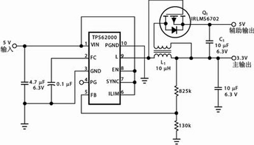 圖2是一種設計頗為緊湊的雙電壓輸出電路,工作頻率750kHz,變換效率可達95%。其中,3.3V主電源由降壓型單片同步開關電源TPS62000構成;該器件具有軟啟動功能,能夠有效抑製輸入浪湧電流與輸出電壓過衝,最大輸出電流600mA。TPS62000的輸出端“L”為低電平時,外接P溝道場效應管Q1隨之導通而令儲能電感L1副繞組的感應電壓向輸出電容C1充電,C1之端電壓同3.3V主輸出疊加即為輔助輸出電壓,其數值取決於L1主、副繞組的匝數比;輔助輸出若為5V,匝數比可取2:1。