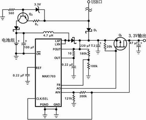 不少便攜式USB設備脫離主機後改由內部電池組通過直流變換器繼續供電,故而需要配備一個小型UPS電源,圖3便是一種由單片開關電源MAX1703構成的實用電路。該集成器件采用同步整流PWM升壓型電路結構;可以單節鎳鎘/鎳氫電池供電,最低輸入電壓0.7V,輸出電壓可調範圍為2.5~5.5V,最大輸出電流1.5A,電源變換效率可達95%。圖3中,MAX1703開關電源“POUT”端的輸出電壓設定為3.4V,而由P溝道場效應管Q1與片內備用放大器構成的線性穩壓器輸出電壓為3.3V,故而USB外設由電池組供電時Q1的功率損耗幾乎可以忽略。外部設備與USB口接通時,二極管D1為正向偏置而使開關電源處於“空閑”狀態;也就是隻要Q1的源極電壓高於3.4V,外部設備便始終由USB口供電。與此同時,USB口還通過PNP晶體管Q2等組成的恒流源向電池組充電,調整電阻R1的阻值可以設定充電電流,使之符合十小時充電製的要求。一旦外部設備脫離USB口,開關電源便會立即退出“空閑”狀態而由內部電池組繼續供電。