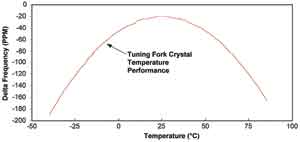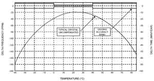 溫度的不穩定和相應的溫度係數是許多應用所麵臨的問題,特別是那些工作在寬溫範圍的應用,如室外電表或水表。標準的用作RTC時基的32.768kHz音叉晶體的頻率響應與溫度之間的關係為Δf/f=k(T-T0)2+f0。其中,Δf為頻率偏差,f為基頻,k為曲率,T為溫度,T0為折點溫度,f0為折點溫度處的頻偏。