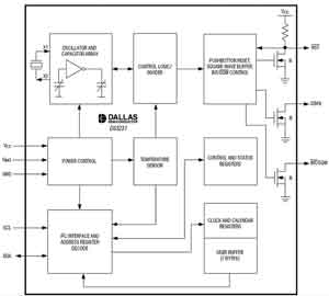本節將以Maxim公司的DS32kHz溫補晶體振蕩器為例,介紹通過改變晶體負載電容修正由於溫度變化產生的頻偏的概念,如圖2所示,Maxim的這項內部校準技術還獲得了專利。DS32kHz可以作為大多數係統的32kHz輸入,如RTC或內置RTC的微控製器。