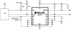 如圖5所示,典型的DS3231應用電路內部集成了晶體,其他電路類似於普通RTC,設計人員無須考慮分立晶體的選擇和布板。因為DS3231包含經過溫度補償校準的振蕩器,可顯著提高RTC的初始精度和溫度穩定性。由於內嵌在封裝內的晶體已經經過高溫老化處理,DS3231與分立的晶體相比具有更好的長期穩定性。精度可以達到±2×10-6,溫度範圍0~+40℃。