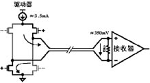 一個簡單的LVDS傳輸係統由一個驅動器和一個接收器通過一段差分阻抗為100Ω的導體連接而成,如圖1所示。驅動器的電流源(通常為3.5mA)來驅動差分線對,由於接收器的直流輸入阻抗很高,驅動器電流大部分直接流過100Ω的終端電阻,從而在接收器輸入端產生的信號幅度大約350mV。通過驅動器的開關,改變直接流過電阻的電流的有無,從而產生“1”和“0”的邏輯狀態。在有些最新生產的LVDS接收器中,100Ω左右的電阻直接集成在片內輸入端上了,如MAXIM公司的MAX9121/9122等。