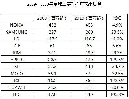- 2010年全球手機出貨量增幅高達20.8%