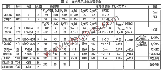 從附表中可以了解到幾種頗具代表性的MOS管的主要特性數據。現以日立公司的老牌LDMOS管K135/J50為例加以說明。K135/J50的柵一源開啟電壓閾值為一0.15~一1.45V。實測當Io=10mA時VO.25V,而當I~=100mA典型值時V增加到0,6~0、85V。可見場效應管的壓控特性決定了柵一源損耗電壓是隨漏極電流I增大而上升的(相對於這一點,雙極晶體管的V幾乎恒為0.7V)。MOS管的內部損耗主要取決於漏源導通電阻R、的大小。K135/J50的參數中沒有直接給出RDs1這一項,但是通過漏源導通電壓VDs(sat):12V和ID7A兩個數據,利用公式RDs(oN)=UDs)/ID可計算出K135/J50的R、約為1.7Q。這相當於把一個1.7Q的電阻與負載串聯,對於標準的8Q負載而言其損失的功率已接近20%。