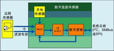 具體來說,數字溫度傳感器的主要構成包括一個雙電流源、一個Δ-Σ A/D轉換器、數字邏輯和一個通向數字器件(如與一個微處理器或微控製器連接)的串行接口(如I2C總線、SMBus或SPI)。數字溫度傳感器有兩種:本地或遠程溫度傳感器,它們均采用某種方法強製兩個成比例的電流通過一個連接成二極管形式的NPN或PNP晶體管,均用於測量所導致的VBE變化,使用Δ-ΣA/D轉換器對電壓采樣並將數值轉換成數字格式。強製電流一般采用約10:1的比例。通過強製施加比例電流和測量兩個VBE的差值,可消除二極管上IS這一與工藝相關參數的一階效應。