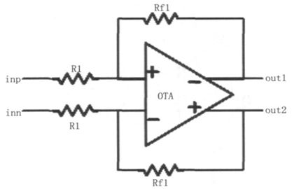 D 類音頻功率放大器的輸入放大級是基於運算放大器(OTA)的閉環結構來實現的,其結構如圖4所suo示shi,用yong來lai根gen據ju需xu要yao對dui輸shu入ru的de音yin頻pin信xin號hao作zuo電dian平ping調tiao整zheng和he信xin號hao放fang大da處chu理li,使shi輸shu入ru信xin號hao在zai幅fu度du方fang麵mian能neng滿man足zu後hou級ji電dian路lu的de要yao求qiu,輸shu入ru放fang大da級ji的de增zeng益yi可ke以yi通tong過guo設she置zhiRf1和R1 的阻值來決定。