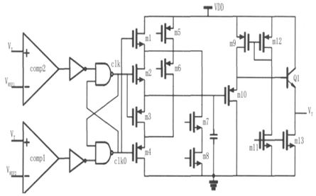 本文采用的三角波產生電路結構如圖6 所示,其中m5、m6 和m7、m8 構成了兩組恒流源,m9~m13 和Q1 構成了輸出級。在電路中,采用將輸出信號VT 分別反饋到比較器comp1 和comp2,與參考電平VREF1 和VREF2(VREF2<VREF1)進行比較,並通過一組數字電路產生兩路反向的時鍾信號clk 與clk0,來控製m2 和m3 的開啟和關斷,從而達到對電容C 進行充放電,產生三角波信號VT 的目的。