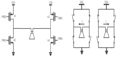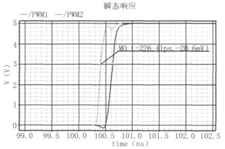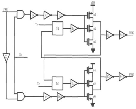 驅動電路結構如圖8 所示,該電路能有效調節死區時間(N 型、P 型功率開關管同時關斷),防止單臂"shoot- through"現象,並有保護關斷功能。輸入信號為比較器輸出的PWM 脈衝信號,PWM1用來驅動N 型功率開關管,PWM2 用來驅動P 型功率開關管。為了避免全橋開關電路中的單臂"shoot- through"現象,當PWM 信號從低電平變為高電平時,PWM2 應首先變為高電平, 關斷PMOS 功率開關管,隨後PWM1 再變為高電平,開啟NMOS 功率開關管,如圖9 所示;反之,當PWM 信號從高變為低時,PWM1 先變為低電平,關斷NMOS 開關功率管,隨後PWM2 再變為低電平,開啟PMOS 開關功率管。實際電路中,可以根據需要通過控製延遲單元的控製位Tc laitiaozhengsiqushijiandechangduan。weijianxiaoshizhen,bixujianxiaosiqushijian,gaiqudongdianlucaiyonglezhujizengjiaqudongnenglidefangshilaiqudonggonglvguan,congerjianxiaolebiyaodesiqushijian,baozhengledishizhendu。