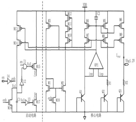 電路上電時偏置電路可能會出現零電流的情況,需要啟動電路保證電路能夠正常工作。電路不工作時,EN、Vs1 為0,Vs2、Vs3 為1,M15、M17 不通,運放輸出為高,M3~M6 也不通,整個電路不消耗電流。當EN 由0 變成1 時,由於C1 的作用,Vs1 保持為0,Vs2 為1,Vs3 變為0,此時M15、M17 導通,inp、inn 分別被拉到0、1,運放輸出變為0,M3~M6 導通,M13、M14 支路開始有電流,並對C1 充電,直到Vs1 高過I2 閾值電壓時,Vs2 變為0,Vs3 則變為1,M15、M17 關斷。最終電路偏離零電流狀態,開始正常工作,且Vs1 充至電源電壓,整個啟動電路不再消耗電流。